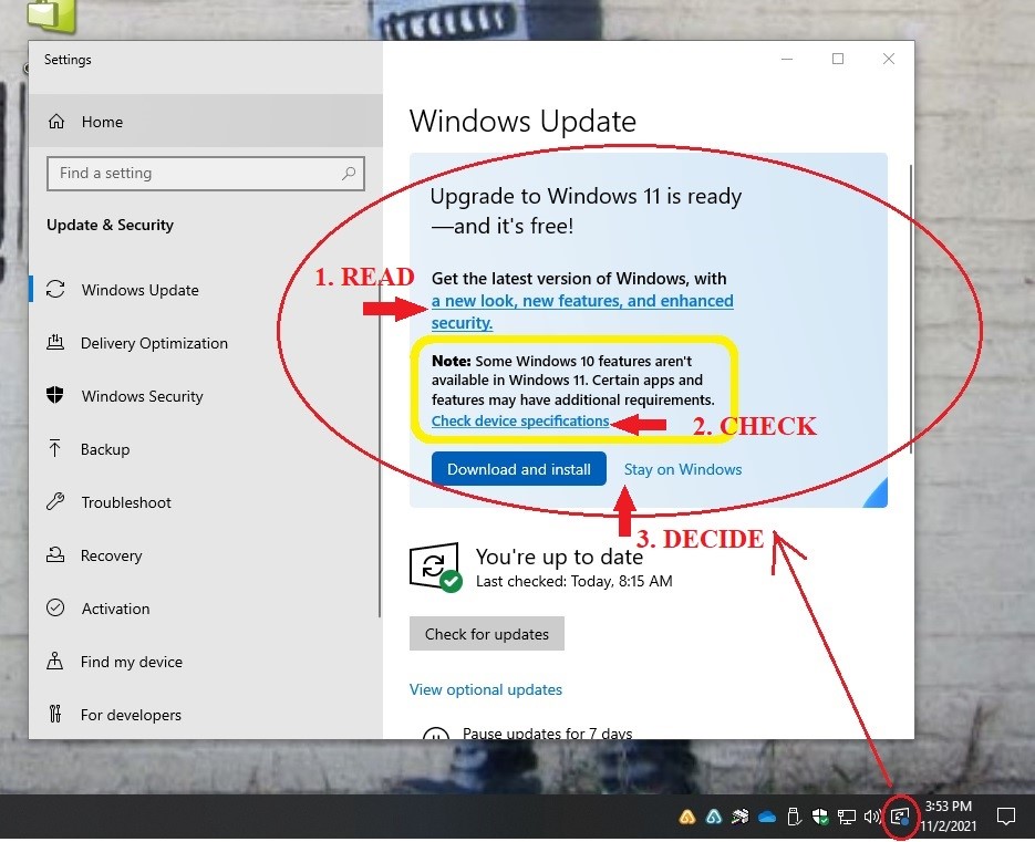 If you have seen the update, have you ignored it? You might be able to upgrade to Windows 11. Most notably, the Windows update icon down by your clock won't go away and now has a blue dot on it (instead of an orange/yellow or red one) like this: