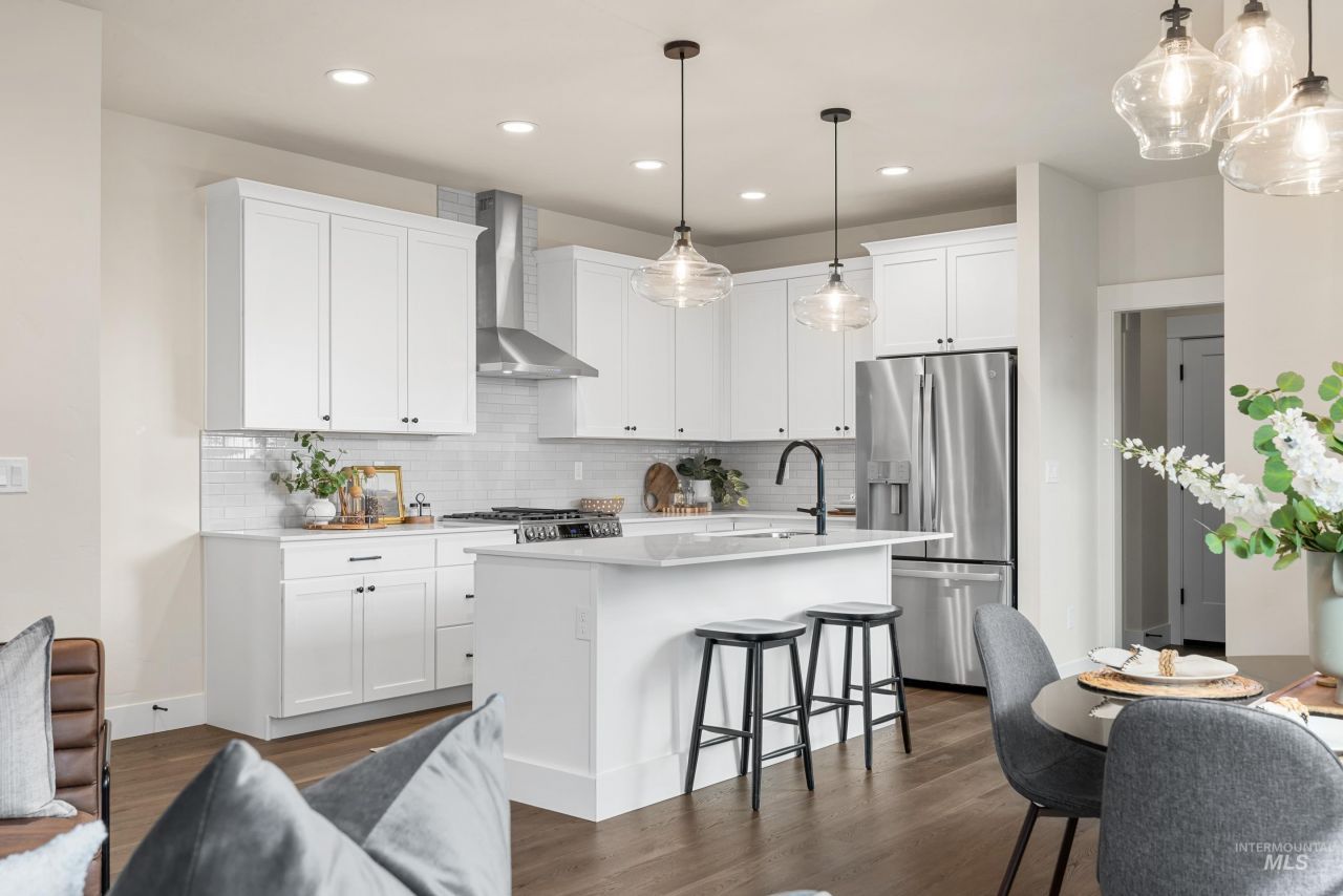 Immaculate & move in ready, this is truly turnkey living in the heart of Eagle, Idaho. 3 bedrooms plus a dedicated office make this home as functional as it is beautiful. Tucked into a quiet, low-maintenance community just minutes from downtown Eagle. Inside, the light-filled layout features 9 ceilings and an open flow anchored by a stunning kitchen with quartz island, soft-close cabinetry, under-cabinet lighting, and designer pendants. Thoughtful details elevate the home: custom molding and accent walls, fully wrapped windows, extended baseboards, and statement sliding door leading to a flexible office or lounge area. The living room centers around a cozy gas fireplace with tile surround and custom window coverings throughout. Generous bedrooms, ample storage, walk in closets, and meticulous care throughout make this home a great investment. Outside, enjoy a private courtyard with gas stub and café lighting. All of it just moments from downtown Eagle, the Boise River Greenbelt, Guerber Park, Eagle Hills Golf Course, and quick access to Highway 55 for weekends in the mountains. Clean, elevated, and effortlessly livable?this is Eagle living done right.