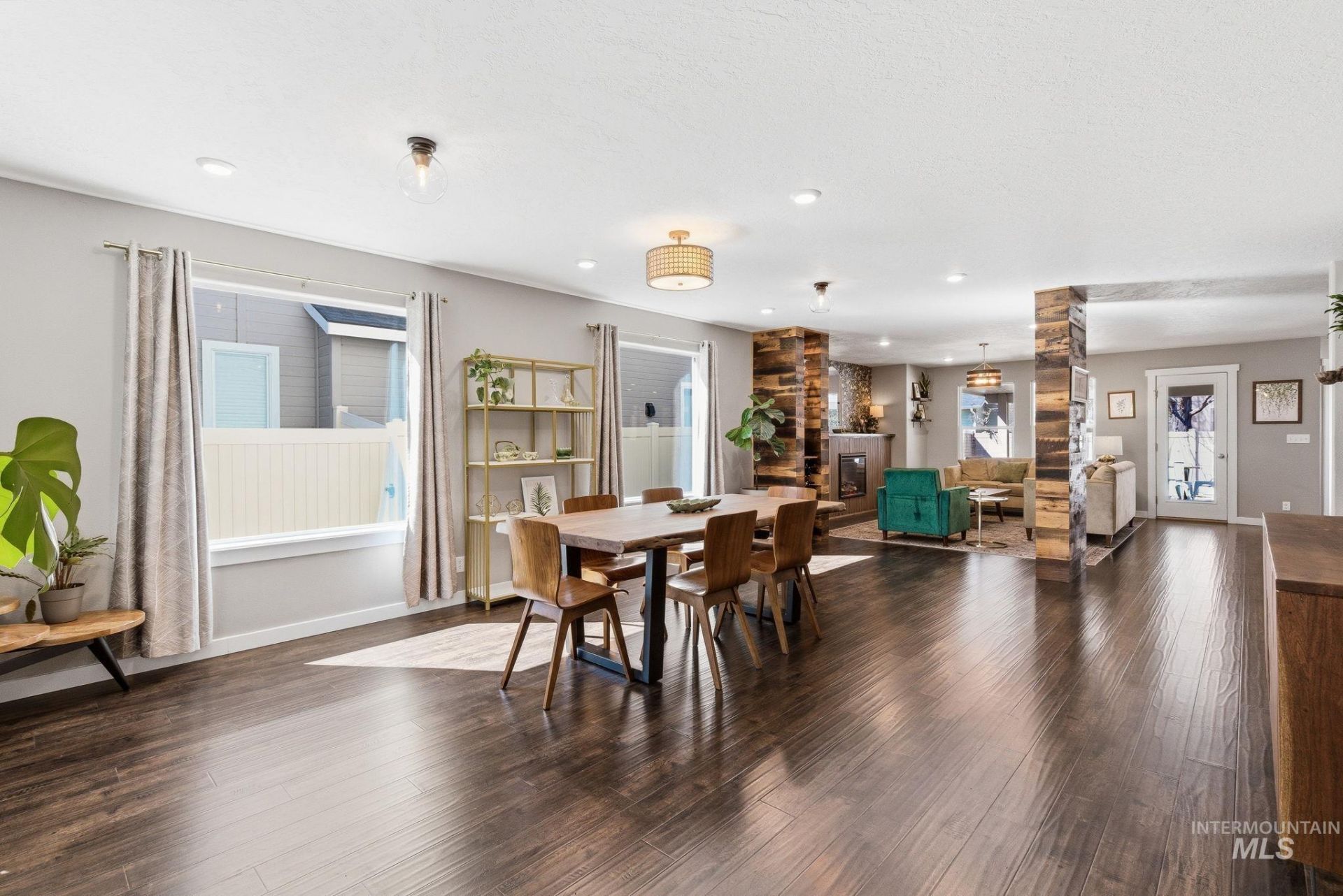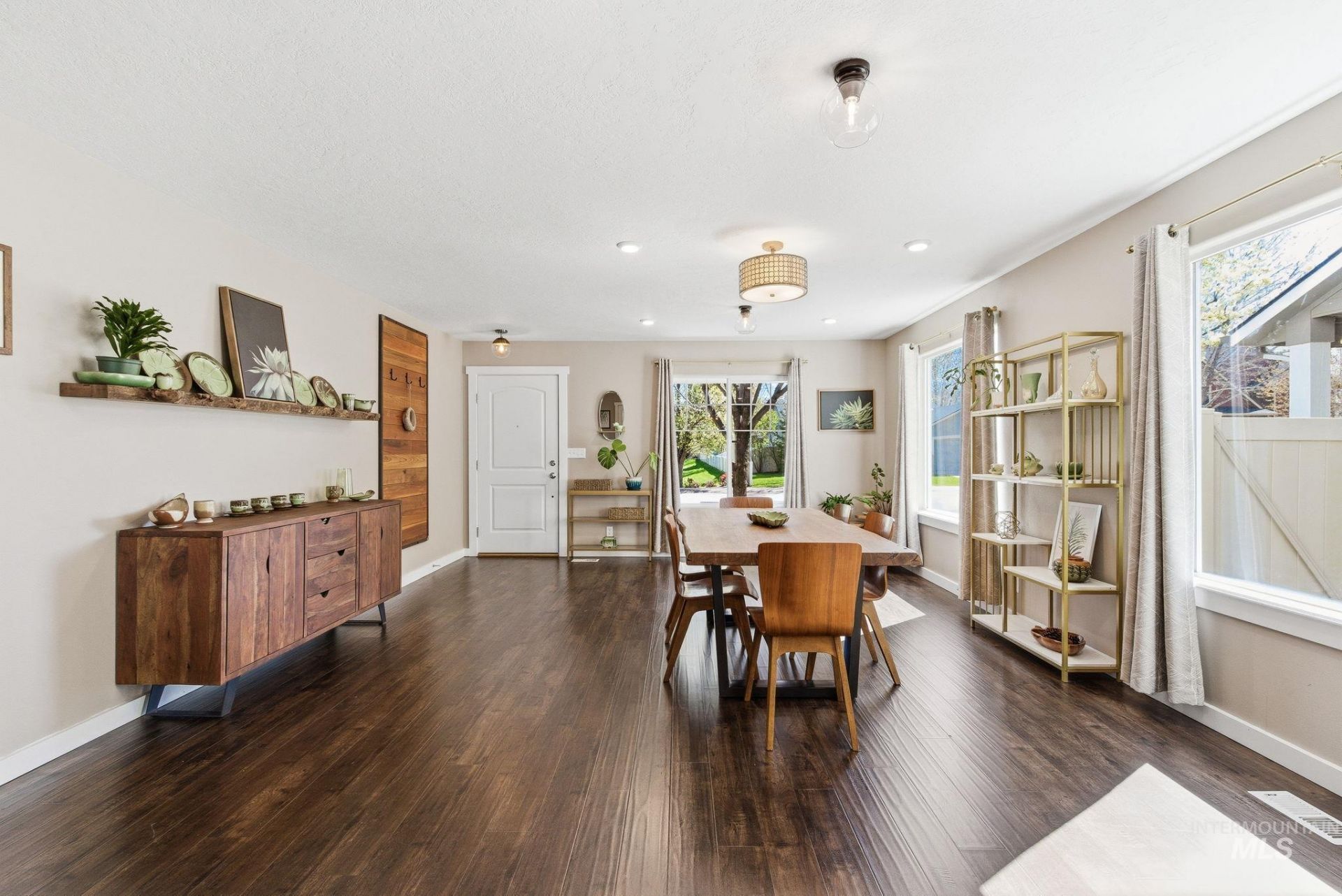 Space, style, & location - all in a home built to entertain. This 6 bed / 2.5 bath, 3,300 SF home in Meridian delivers on every level. The main floor offers the greatest of great rooms ? living, family, dining & kitchen all flowing together in a wide-open layout that extends right out to an entertainers paradise backyard. Designer upgrades throughout include reclaimed wood accent columns, a custom slat-wall fireplace w/ botanical wallpaper, built-in wine niche & updated lighting. The kitchen features white cabinetry, granite counters, wood-plank backsplash, reclaimed wood island w/ bar seating & pendant lights. Main-level master suite w/ dual vanities, stone-surround soaking tub & separate shower. Upstairs: 5 additional bedrooms plus a massive 22x15 bonus room. In the private backyard, youll find a custom pergola w/ privacy screen, built-in stone outdoor bar w/ wood slab top, covered patio, raised garden beds & vertical planters. Attached 3-car garage, full perimeter fencing & auto pressurized irrigation. Laundry room w/ sink, mudroom w/ built-in bench. Quick access to Eagle Rd & Meridian Rd, shopping, the freeway and everywhere. This much space, this level of finish & a backyard like this dont come together often.