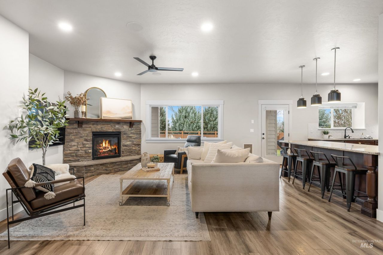 Beautifully maintained home in the sought after Lilac Springs community in Eagle. The layout blends function and comfort with single level living with a spacious bonus room upstairs with a full bath and closet (can be bed 5). The kitchen and all 3 full bathrooms feature granite countertops. The primary suite offers a true retreat with heated tile floors! 3 of the bedrooms feature walk in closets. Garage is built for flexibility with epoxy floors and a mini split for heating and cooling. The 39 foot RV bay includes a 14 foot door and pull through access to the back. There is also a dedicated concrete side pad for trailer or boat parking! RV bay features a large loft with a lift included. 2 x 220 outlets and a sewer dump f/ RV. Enjoy an extended covered patio with a gas firepit, perfect for relaxing or hosting plus extended concrete on the whole back of the home w/ hookups for a hot tub and a storage shed. The fully fenced vinyl backyard offers dedicated space for garden beds and room to create your own outdoor setup. Newer mini split, dishwasher, water softener, and carpets! Lilac Springs features a community pool, pickleball, basketball and tennis courts, scenic pond seasonally stocked with fish, walking paths and wide open green space. This home delivers comfort, utility and the Eagle lifestyle.